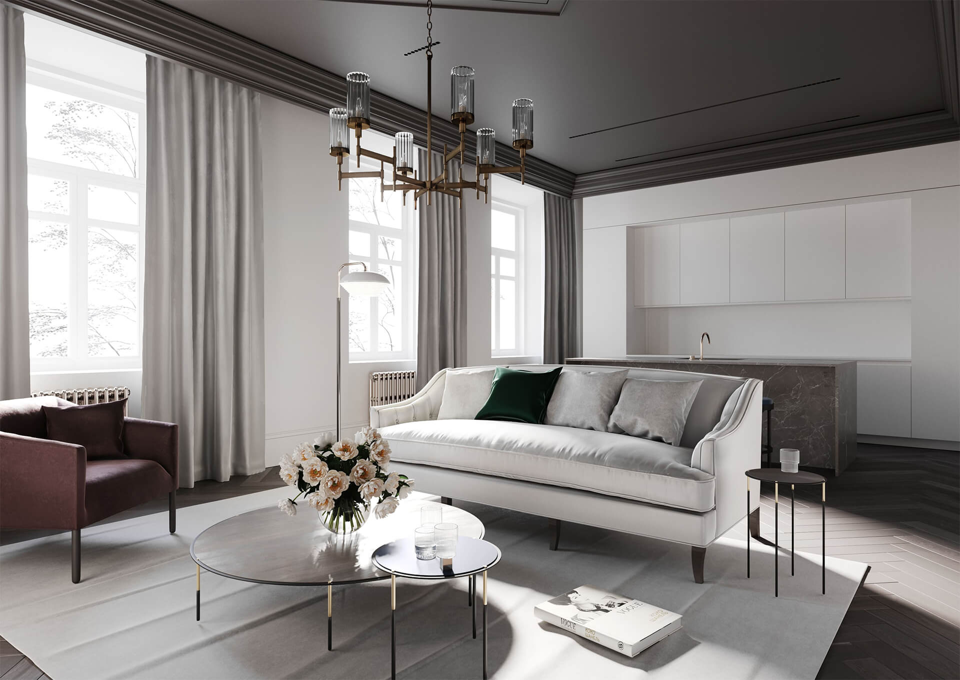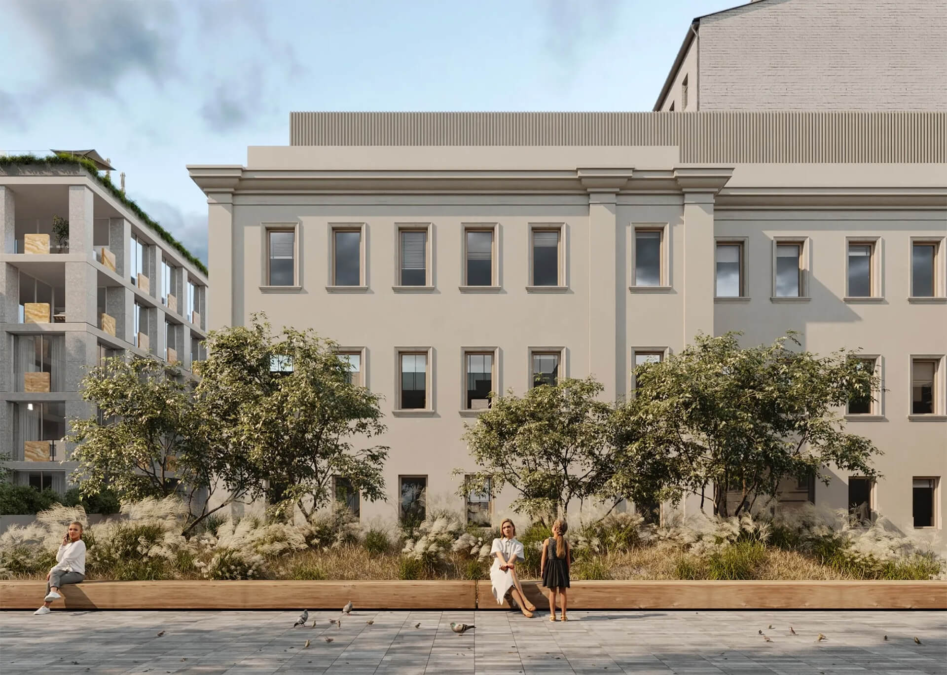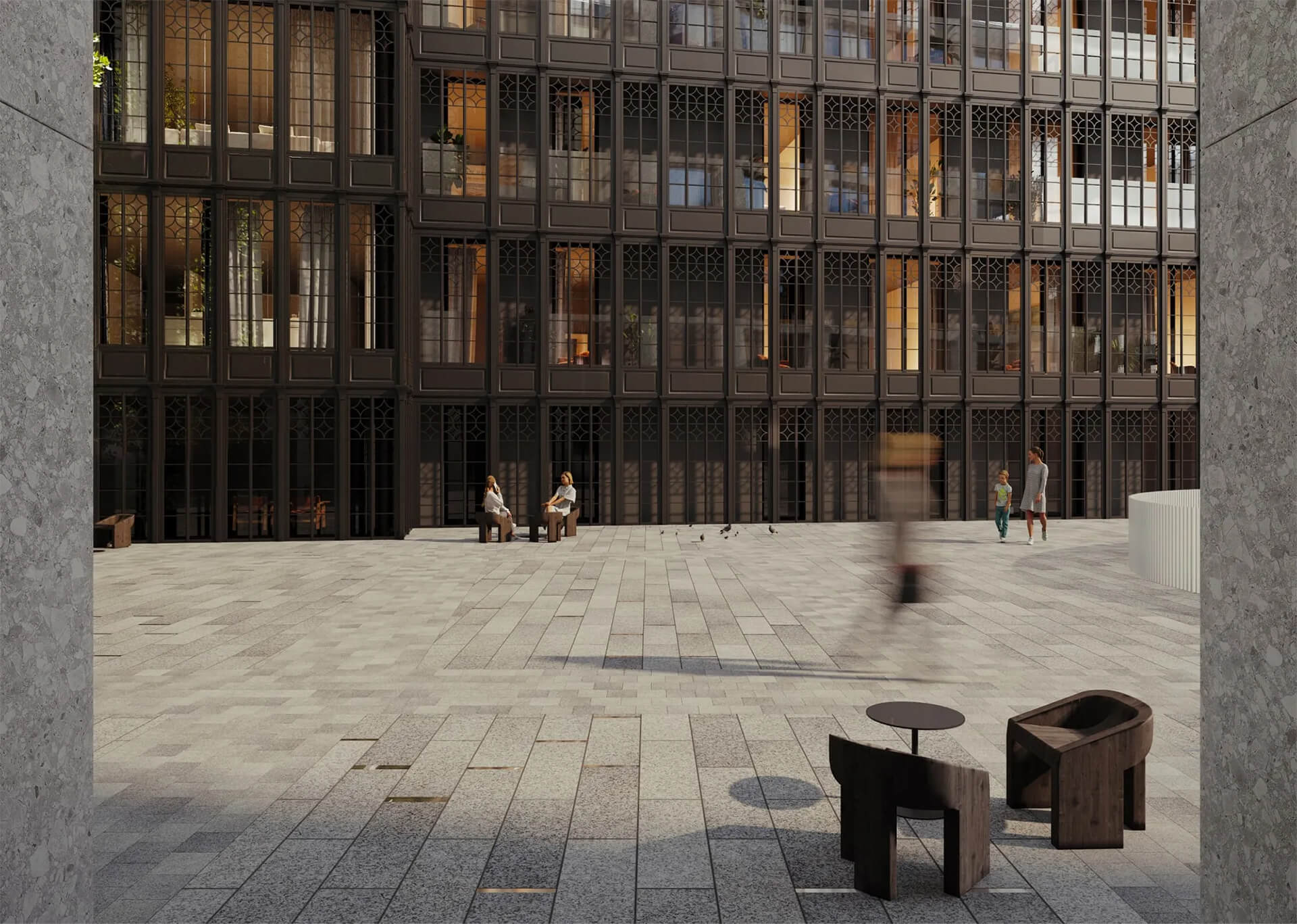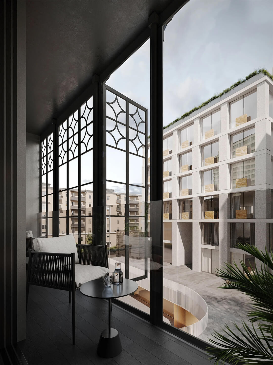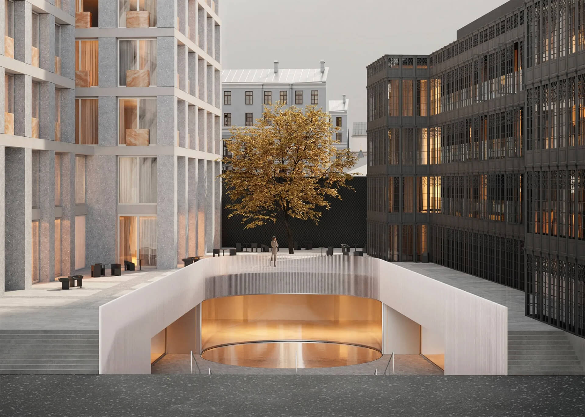 В основе концепции — идея объединения культурной истории района и функциональности современного premium-жилья. Внутренняя организация комплекса создаёт ощущение закрытого клубного пространства с продуманной логистикой и удобными переходами между корпусами. Светлые галереи, атриумы, стеклянные конструкции и естественное освещение усиливают чувство простора, а интеграция природных элементов делает внутреннюю среду по-настоящему гармоничной. Здесь каждая деталь направлена на создание комфортной среды для повседневной жизни и отдыха.