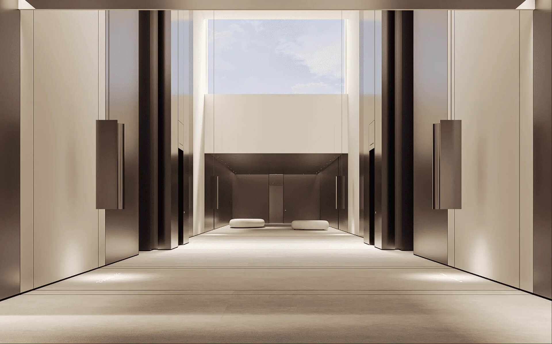 Функциональная составляющая также продумана до мелочей: рецепция, зоны для отдыха, удобные маршруты к лифтам и переходам между корпусами. Пространство находится на отдельном уровне, что дополнительно обеспечивает приватность. Лобби делает первое впечатление о комплексе ярким, подчёркивает его статус и формирует ощущение абсолютного качества во всех деталях.