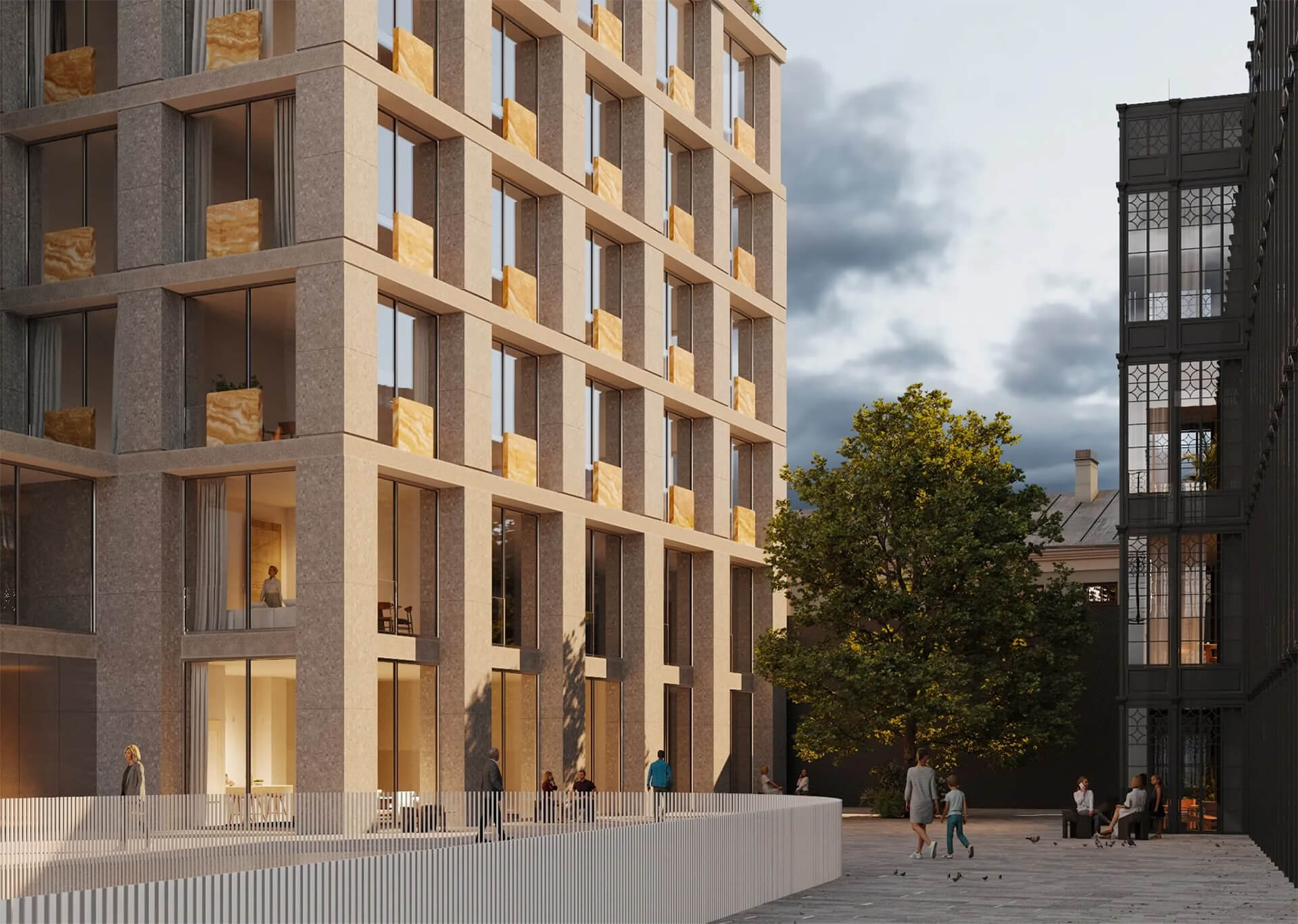 В основе концепции — идея объединения культурной истории района и функциональности современного premium-жилья. Внутренняя организация комплекса создаёт ощущение закрытого клубного пространства с продуманной логистикой и удобными переходами между корпусами. Светлые галереи, атриумы, стеклянные конструкции и естественное освещение усиливают чувство простора, а интеграция природных элементов делает внутреннюю среду по-настоящему гармоничной. Здесь каждая деталь направлена на создание комфортной среды для повседневной жизни и отдыха.